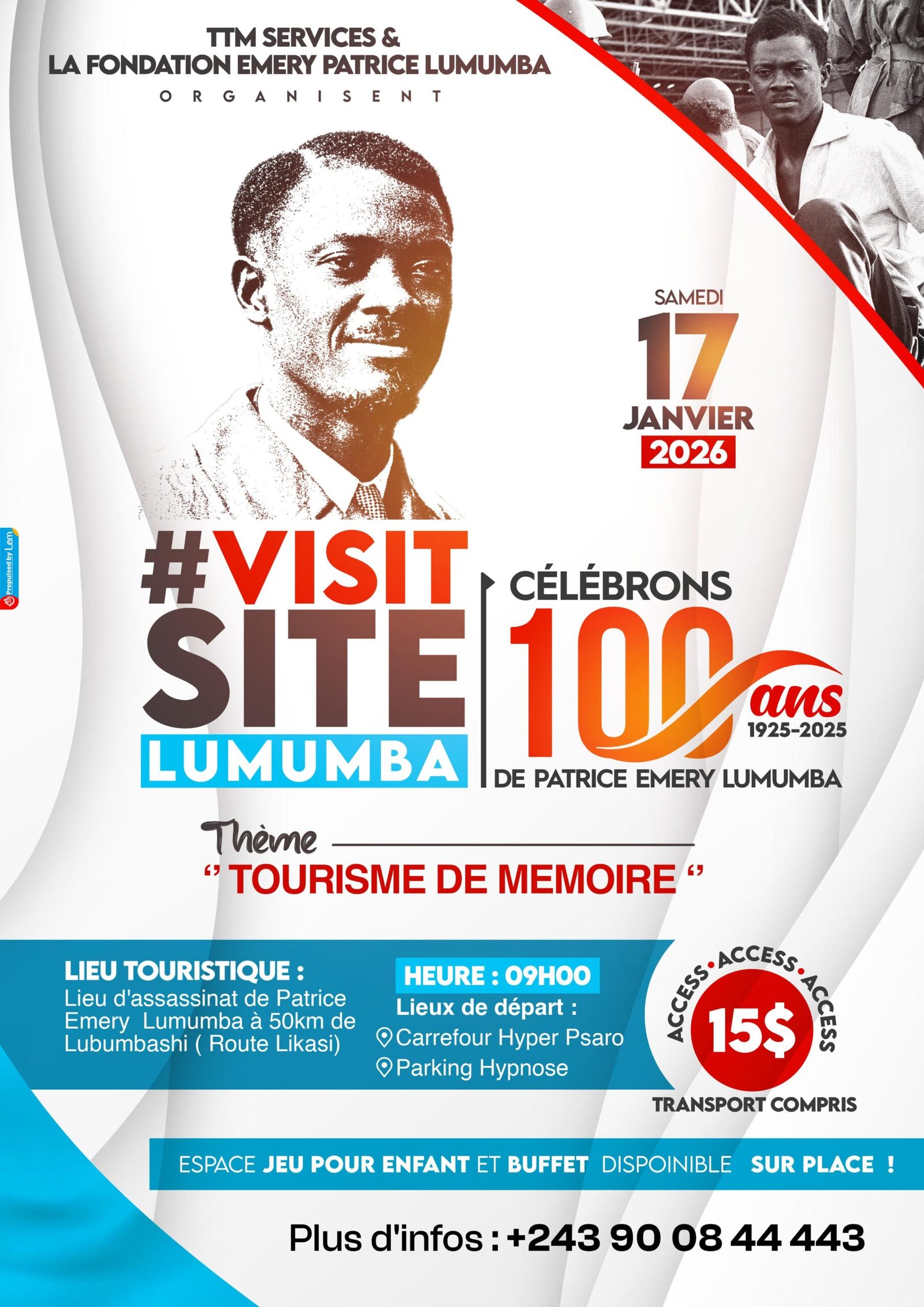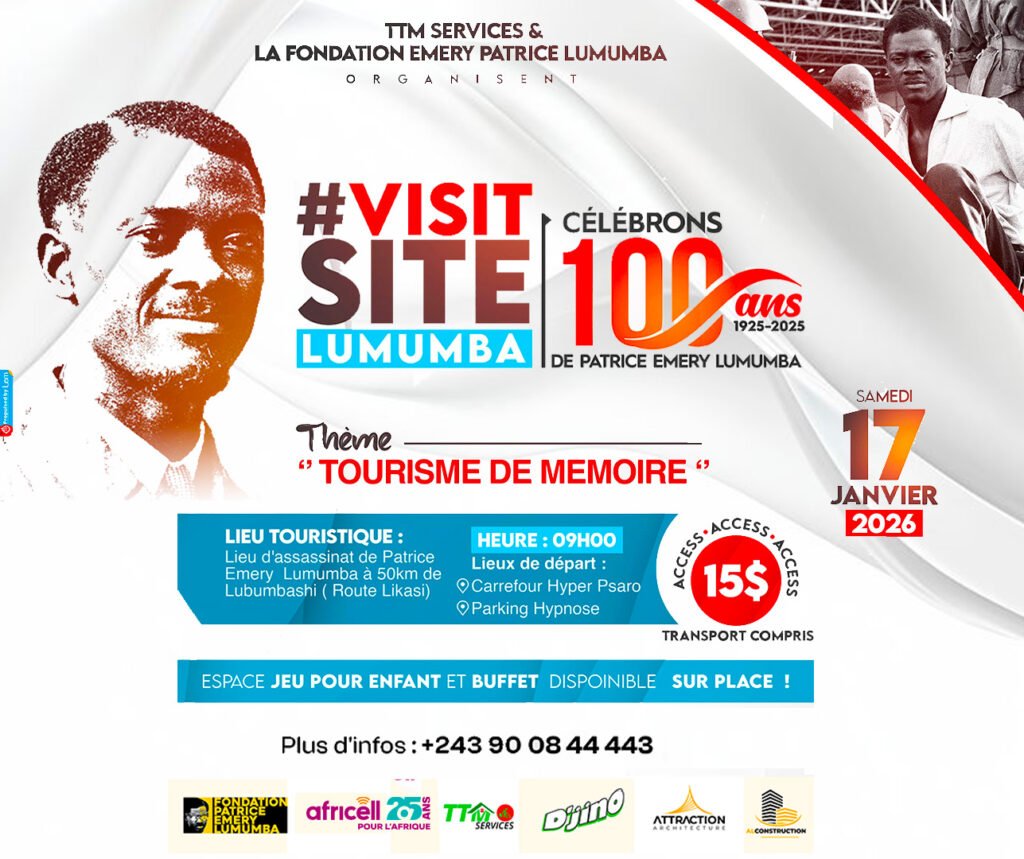 À l’occasion de la 3ᵉ édition du Visit Site Lumumba à Lubumbashi, organisée par TTM Services et la Fondation Emery Patrice Lumumba, venez vivre un moment fort de mémoire et d’histoire sur le lieu même du destin de Patrice Lumumba.